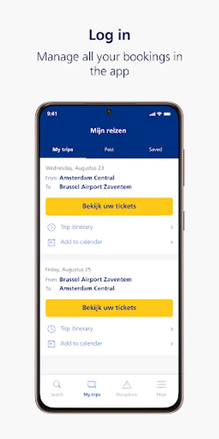 Our real time travel information assists you every step of the way. Easily enable automatic alerts on your trip. We will keep you informed in case of possible disruptions and when it is time to leave. When travelling with a mobile ticket in the app, the automatic alerts are enabled by default.