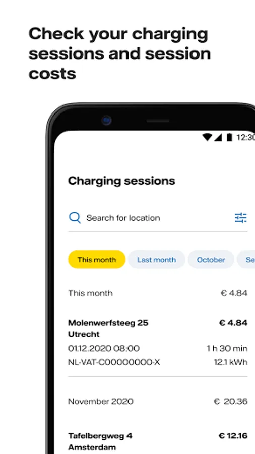 Want to know where you've charged and how much you will have to pay? Log in and view all your charging sessions, in an overview or per charging session. This way you know exactly where you have charged, how much you charged and what you paid or will be invoiced.