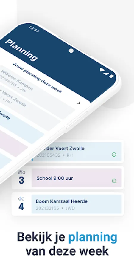 Altijd je weekplanning bij de hand. Wordt de planning last minut gewijzigd? Via een push-bericht wordt het direct aan je doorgegeven.