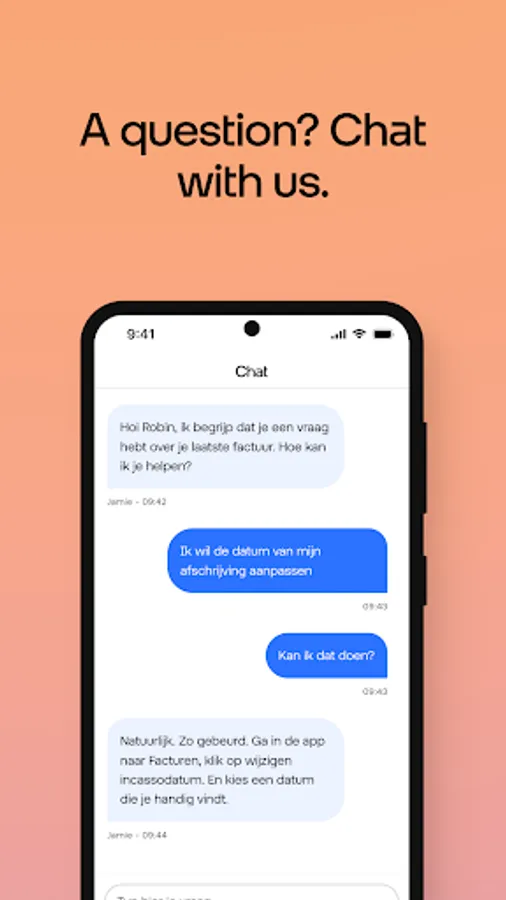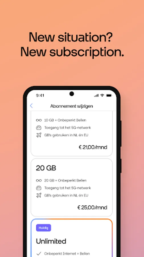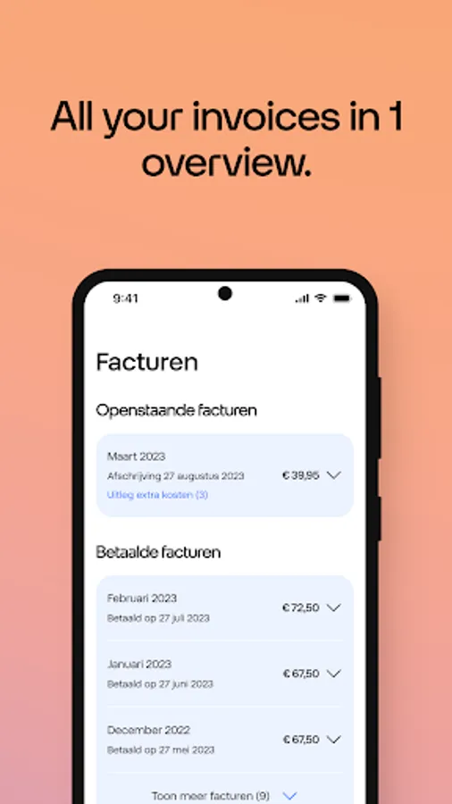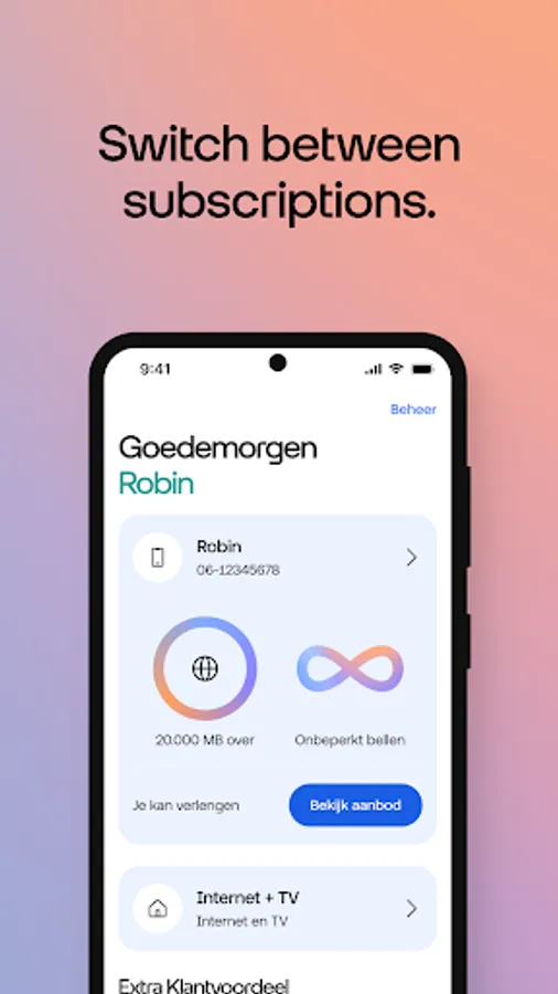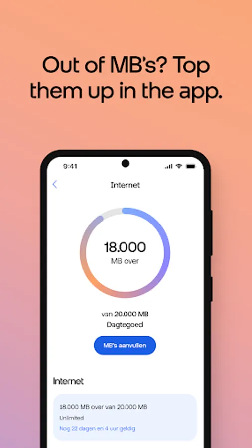 The Odido App gives you immediate insight. Do you have a subscription for internet + TV, mobile, a business connection or PrePaid? Nice. With this app you can quickly check your usage, invoices, subscription, credit, purchases, accounts and much more. Just log in with your Odido username and password. Do you have multiple subscriptions? You can easily add that.
