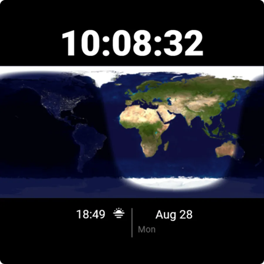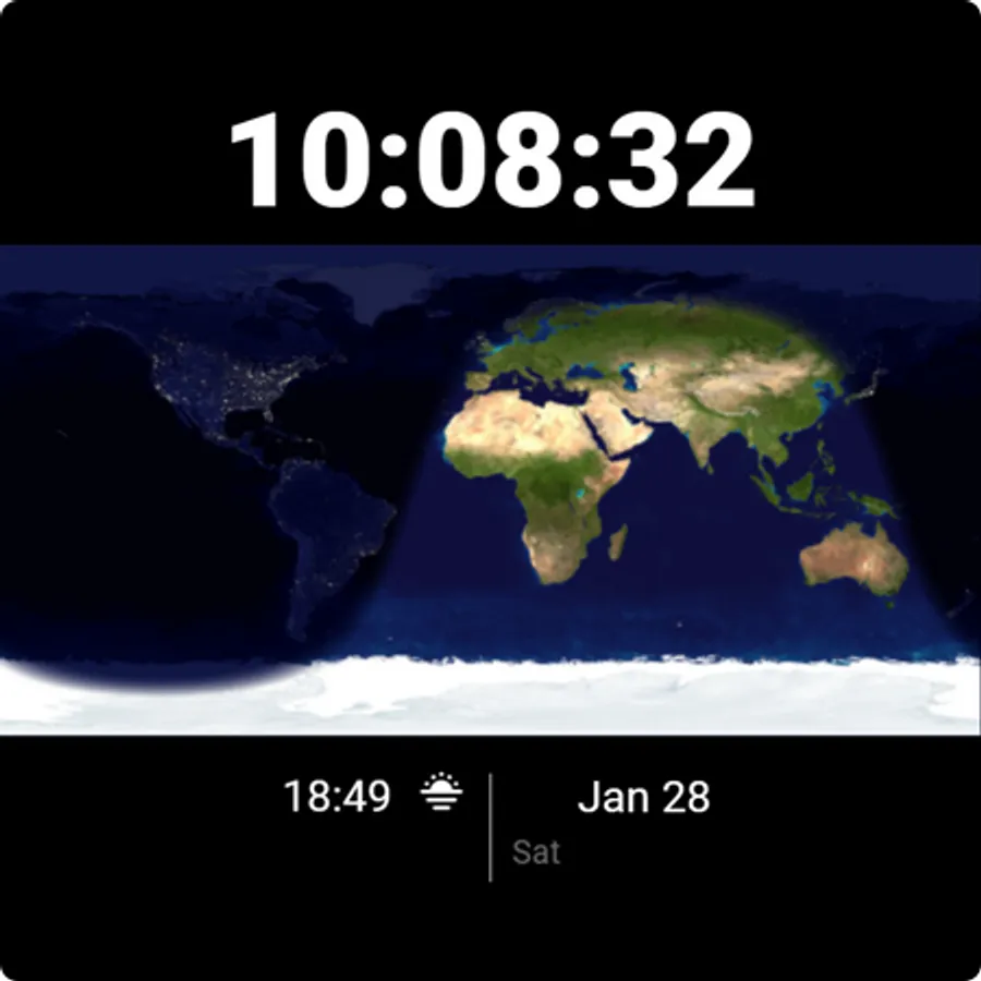 Experience the world at a glance with this innovative watchface that beautifully displays the Earth's dynamic day-night cycle. Showcases real-time sunlight distribution across the globe. As the sun rises and sets, watch as the illuminated regions transition seamlessly to reveal the stunning contrast between day and night. Stay connected to global time zones while marveling at our planet's natural beauty – a perfect fusion of technology and Earth's wonders, right on your wrist.