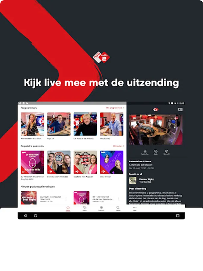 In the NPO Radio 2 app you can listen live, watch in the studio, send a message to the studio, check which music we play and find all broadcasts. You have also come to the right place for our podcasts, such as 30 MINUTES RAW by Ruud de Wild.