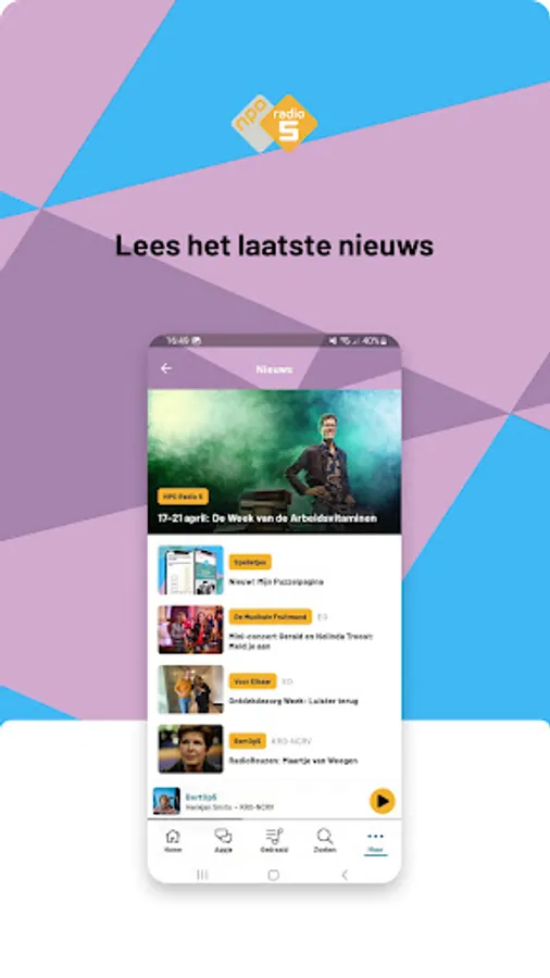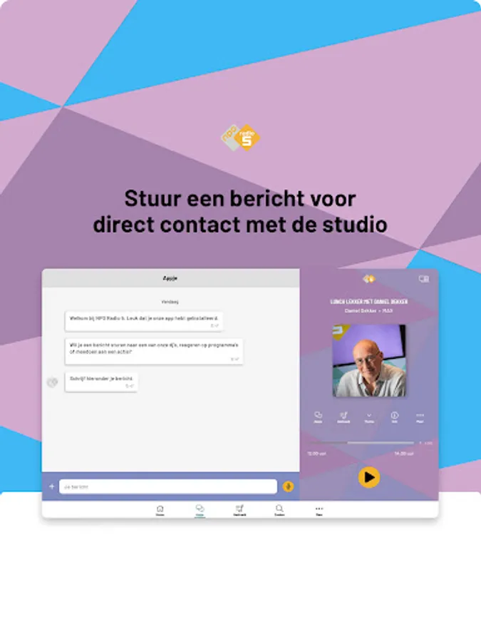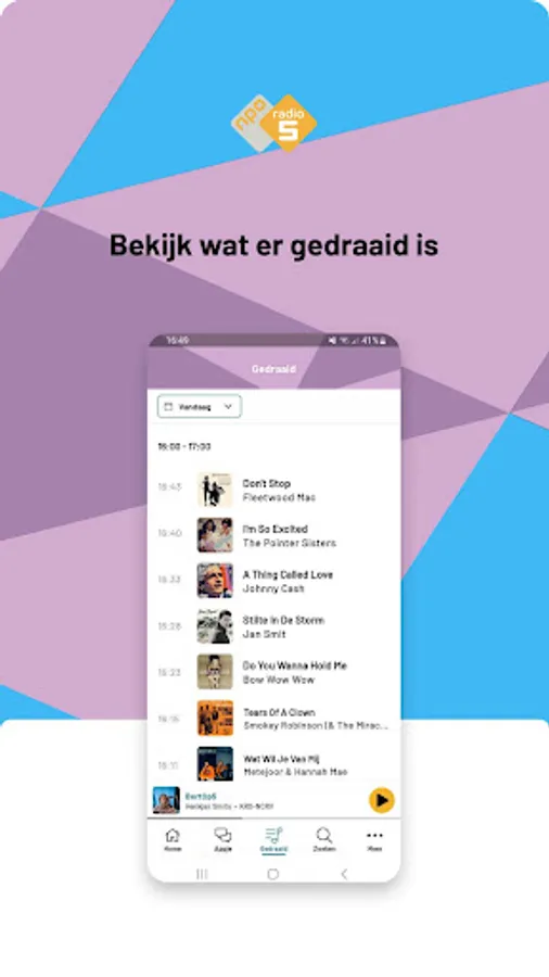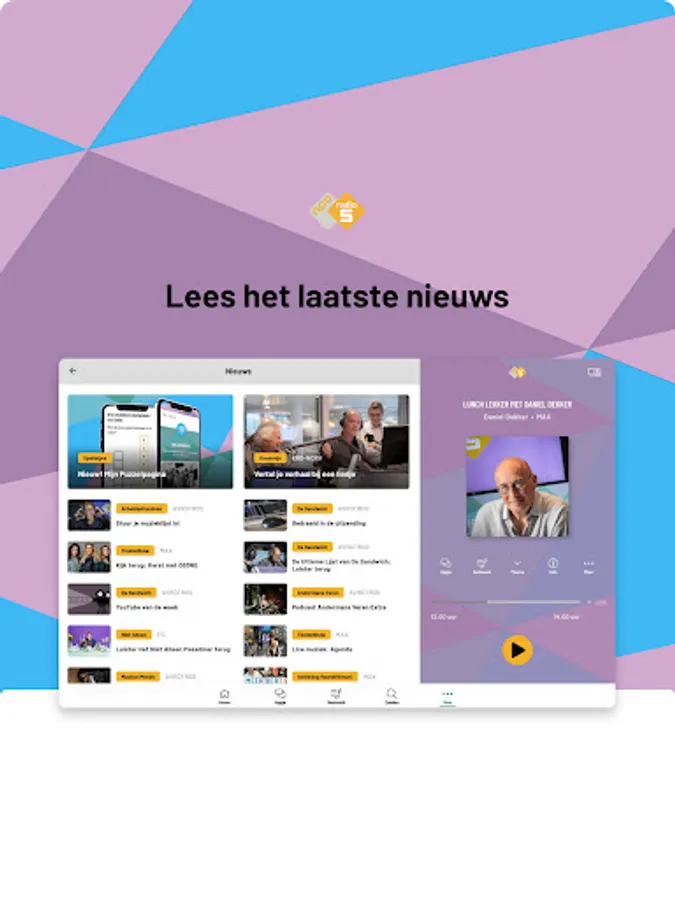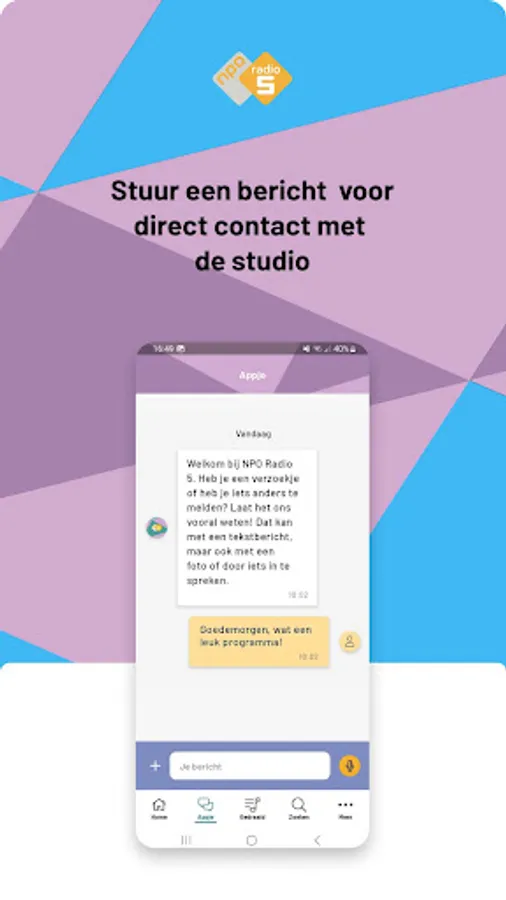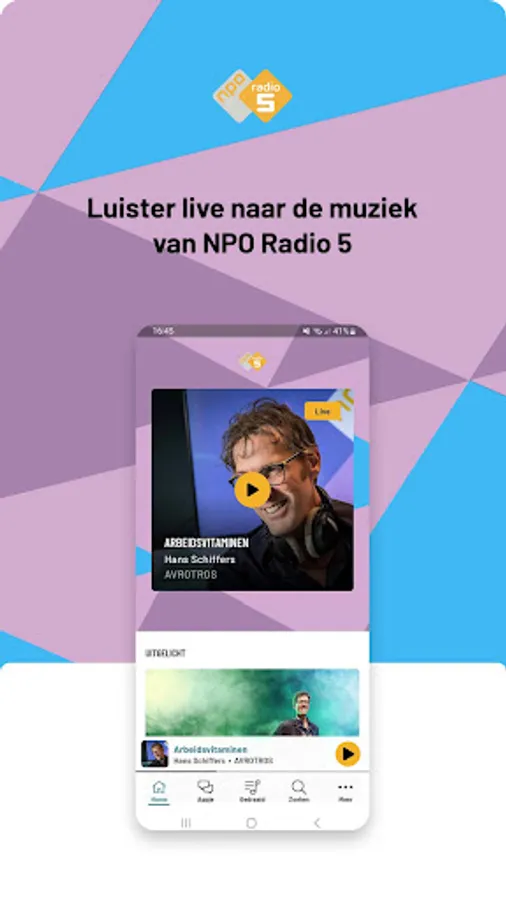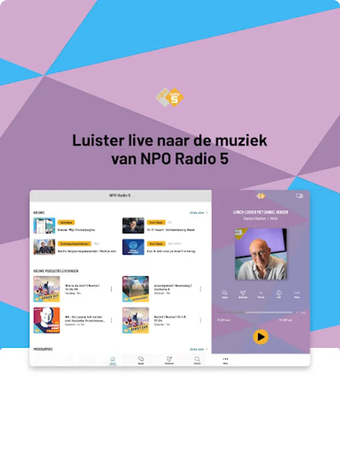 With this app you can listen live to NPO Radio 5 and easily listen back to fragments or missed broadcasts of your favorite programs. You can also send a free message to the studio via the app and listen to / download podcasts.