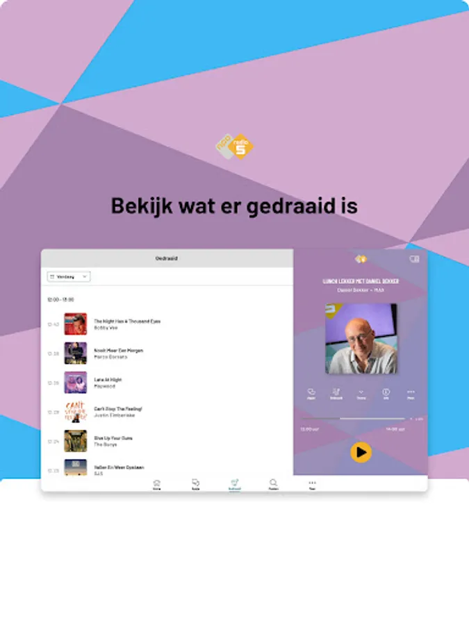 On NPO Radio 5 you will hear music from the 60s, 70s and later in combination with information and service. You feel at home with the channel of, among others, Work Vitamins, Adres Unknown, Gold Mine, De Musical Fruit Basket, Open House, De Sandwich and Andermans Veren. In November we organize the NPO Radio 5 Evergreen Top 1000, the annual list of evergreens from all music decades, compiled by the listener.