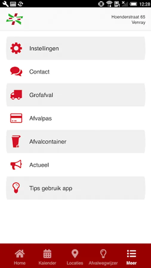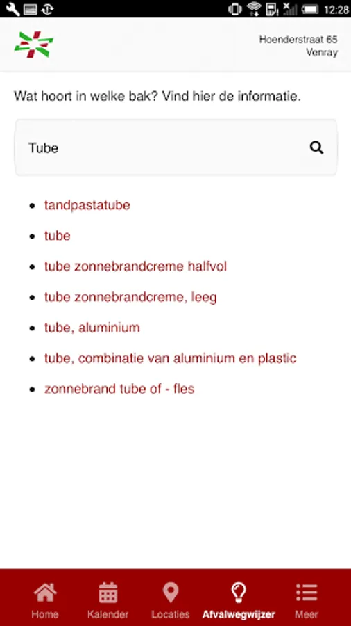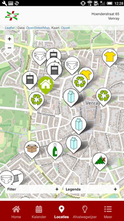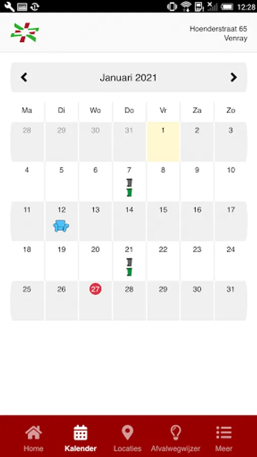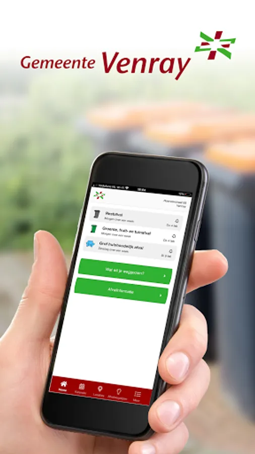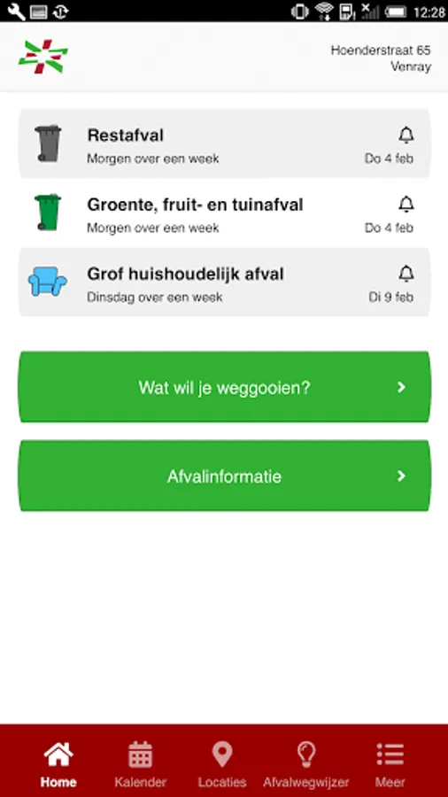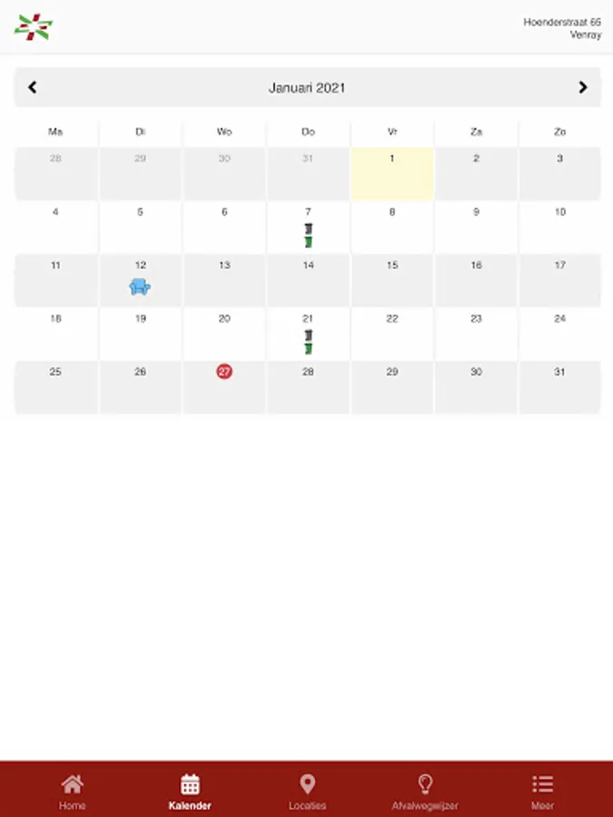 Download the app from Venray and enter your postcode and house number. You will then see your calendar with waste collection days and information about the different types of waste. You can also receive push notifications when you can offer your waste.