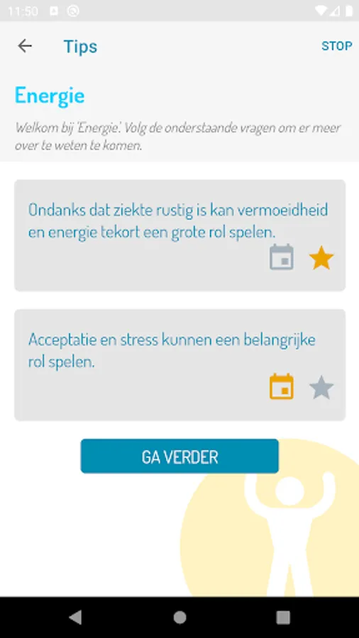Tips - You get questions and tips on all kinds of topics that you choose. For example about exercise, work, medication or pain.