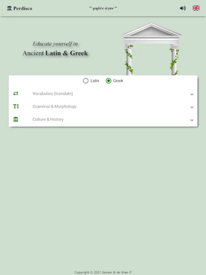 Perdisco is a digital tool and platform to help you perform better in both subjects. Perdisco is co-developed by a teacher of Ancient Latin & Greek with a MA degree. The tests and exercises are checked, accurate and consist of the necessary learning material used by most schools. Perdisco is divided into three main topics: translation, grammar and culture. All three are essential for learning Ancient Latin and Greek.