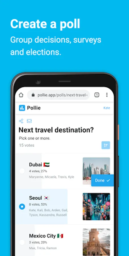 With Pollie you can ask your audience in three simple steps. No account needed!