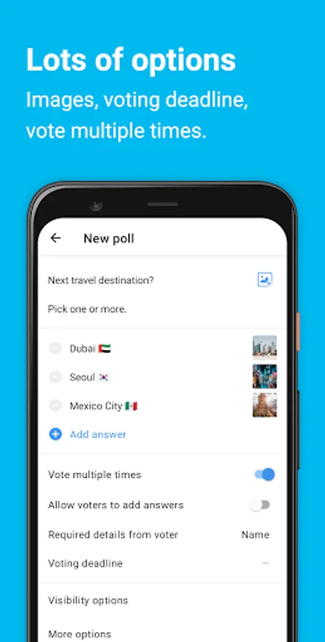 Describe your poll, upload images, allow single or multiple votes, set a closing date and choose what your users can see.