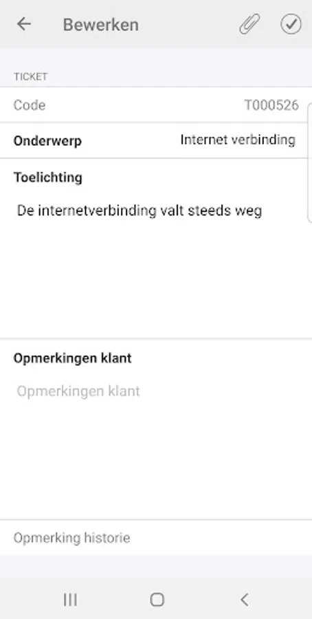 Customers take a picture of the error message, give a short description and submit the ticket. When the ticket is more complex, customers can provide a more detailed description. Your customers have direct insight into all outstanding tickets in the app. You can divide your customers' employees into two groups: a user and a supervisor. The difference between the two is that the supervisor sees all your customer's tickets, while the user only sees his created tickets in the app.
