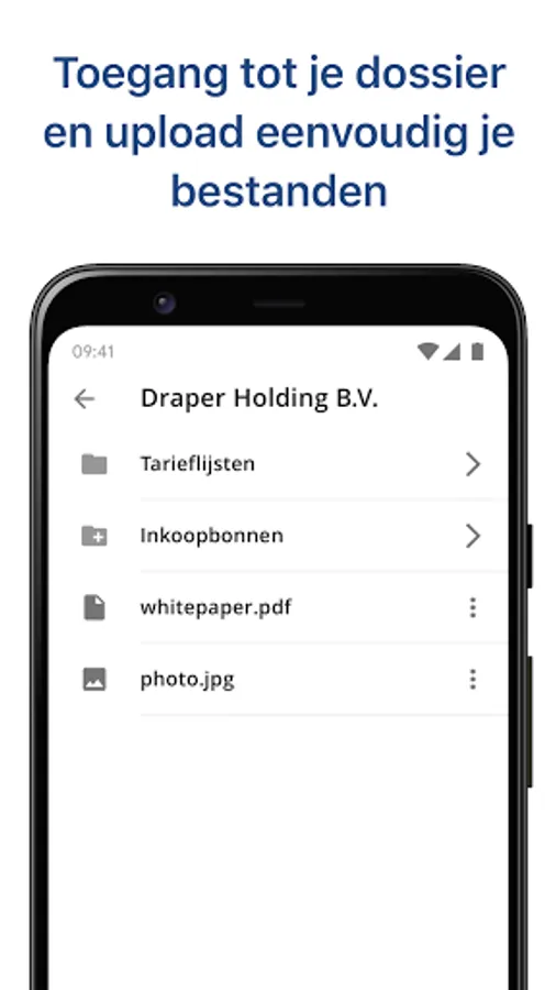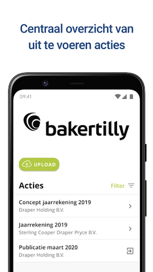 In the My Baker Tilly app you can view your file at any time and anywhere, view specific documents and save or open them in other apps. Moreover, you can easily share files such as invoices and contracts with your accountant, by taking a picture or uploading them from your phone.