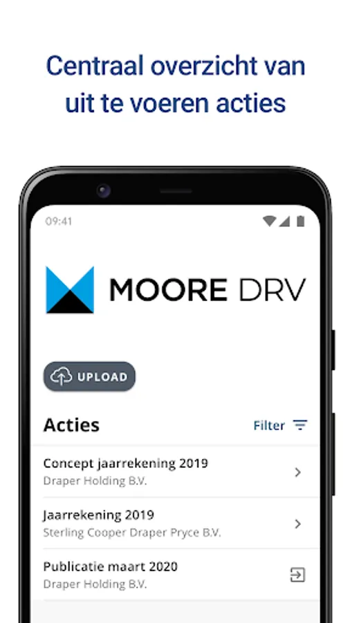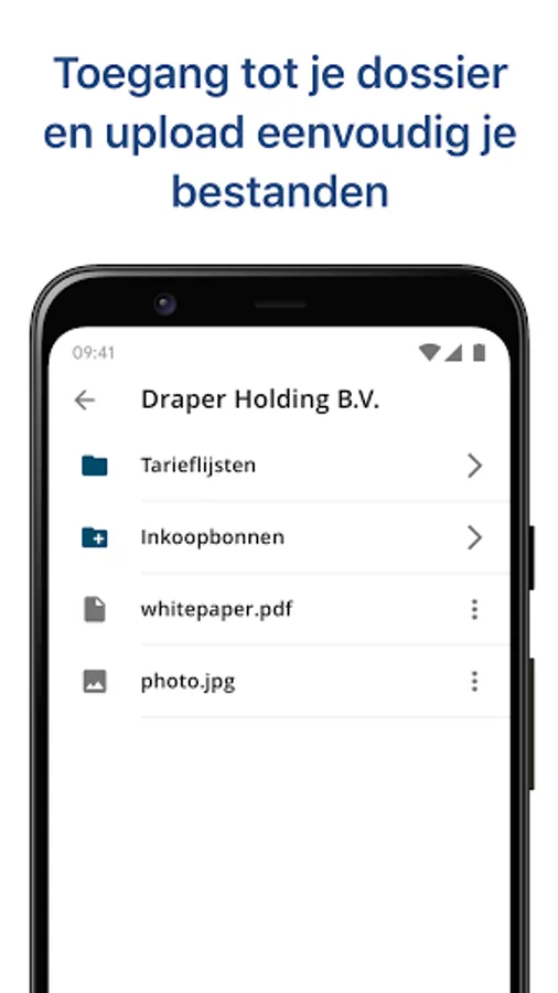 You can view your file at any time and anywhere in the DRV Online app, view specific documents and save or open them in other apps. Moreover, you can easily share files such as invoices and contracts with your accountant, by taking a picture or uploading them from your phone.