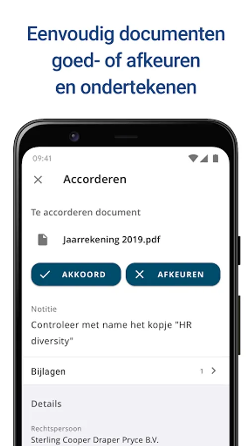 Approve documents like tax returns and financial statements in seconds. These can then be sent directly to, for example, the Tax and Customs Administration or Chamber of Commerce. You will receive a push notification when you can approve a document.