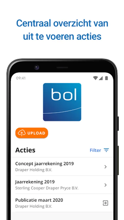 You can view your file at any time and anywhere in the Mijn Bol app, view specific documents and possibly save or open them in other apps. Moreover, you can easily share files such as invoices and contracts with your accountant, by taking a picture or uploading them from your phone.