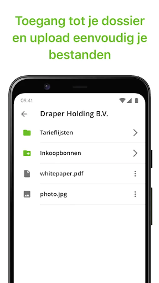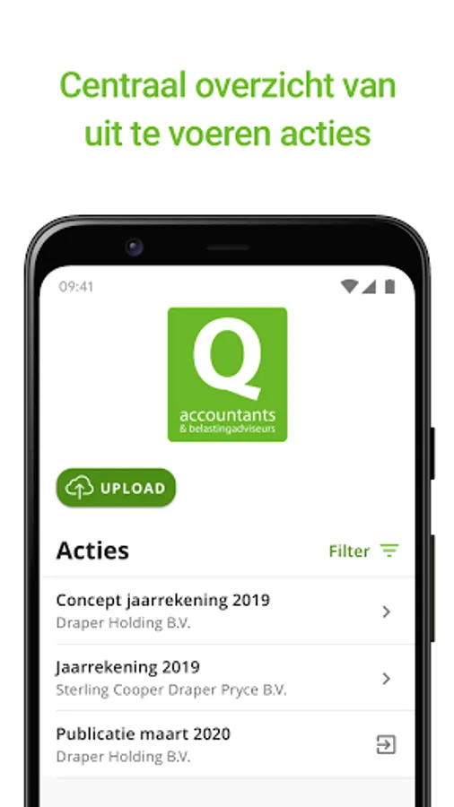 In the MIJN Q app you can view your file yourself at any time and anywhere, view specific documents and possibly save or open them in other apps. In addition, you can easily share files such as invoices and contracts with your accountant by taking a picture or uploading them from your phone.
