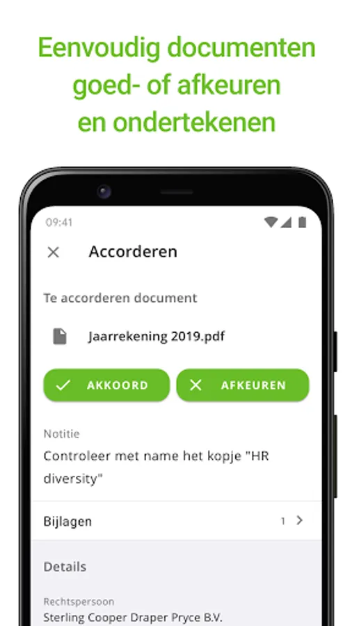 Approve documents such as tax returns and financial statements in seconds. These can then be sent directly to, for example, the Tax and Customs Administration or Chamber of Commerce. You will receive a push notification when you can approve a document.