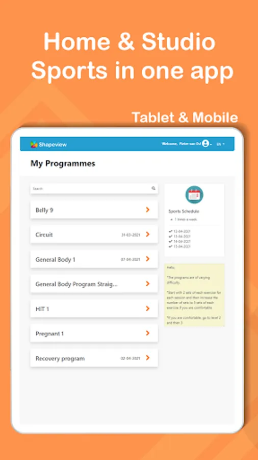 With a subscription to the Shapeview Trainer, you gain access to our online platform, with more than 350 activities and 100 prepared sportplans categorised by muscle group or sport activity. Shapeview Trainer is a software platform which allows you to digitise your gym but can also be used for: