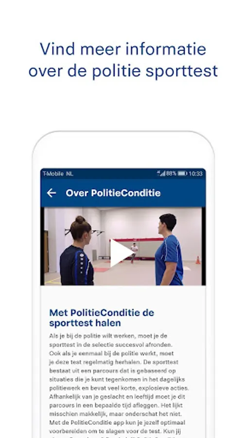 With this free app from the police you can optimally prepare yourself for the sports test of the police. You must successfully complete this test during the selection procedure. Even once you work for the police, you must repeat the test regularly. During the running training sessions, which are becoming one step harder, you perform various exercises such as imprints, sprinting and long jumps. Can you handle level 5 of the app well? Then you have Police Condition and you are ready for the sports test!