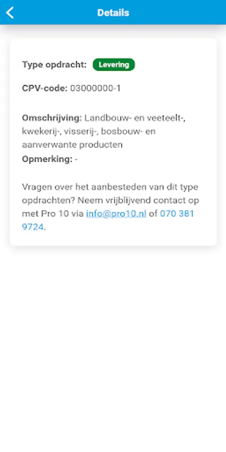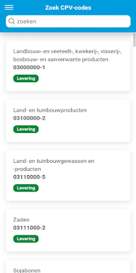 The content of the app has been carefully compiled to unburden today's buyer in his or her search for the right CPV code. In addition to the code, you will also find the descriptions, categories and regimes, both in the current situation and from the moment the new procurement directive has been implemented in the Netherlands.
