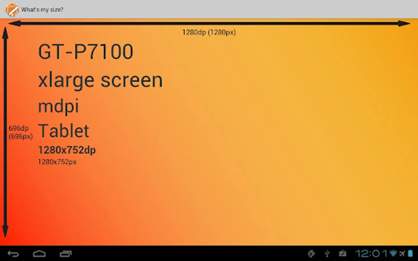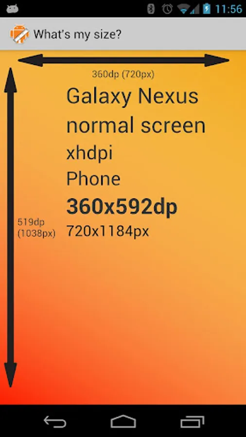 The app shows the actual screen size of your device in both pixels and device independent pixels (dips). It also shows the size of the view, the type of screen (small, normal, large, xlarge) and the screen dpi class (ldpi, mdpi, hdpi, xhdpi, xxhdpi, xxxhdpi).