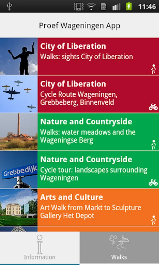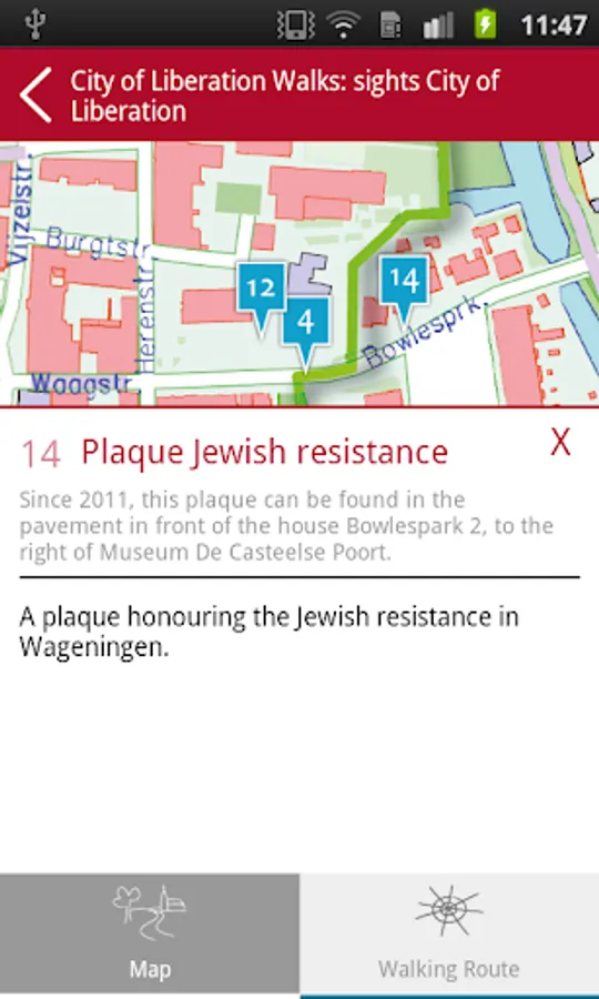The App ‘A Taste of Wageningen’ contains 6 walks and 2 cycle tours in the city of Wageningen and in its surroundings. Each walk/tour comes with a map and accompanying text with directions, as well as information on the sights en route. There is a choice of 4 themes: City of Liberation, Nature and Landscapes, Monuments and Architecture, and Arts and Culture. The walks/tours cover all the highlights of the themes.