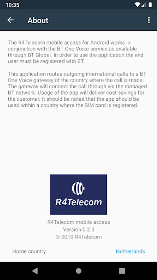 The R4Telecom mobile access for Android works in conjunction with the BT One Voice service as available through BT Global. In order to use the application the end user must be registered with BT.