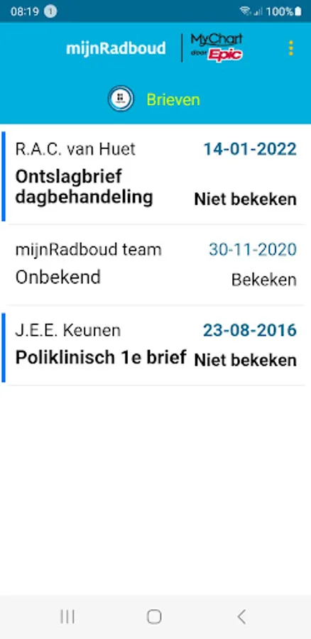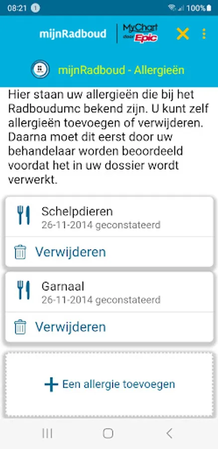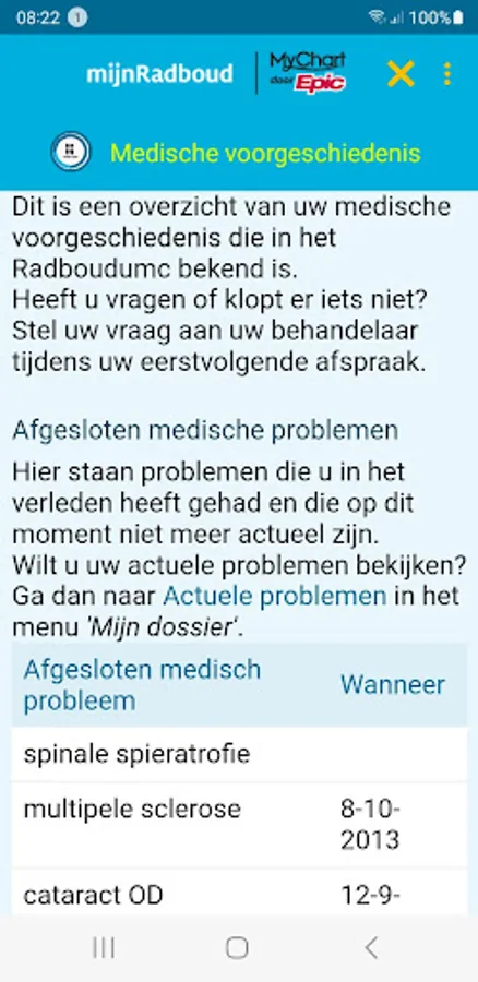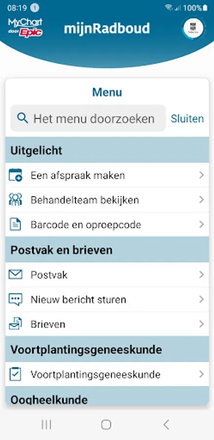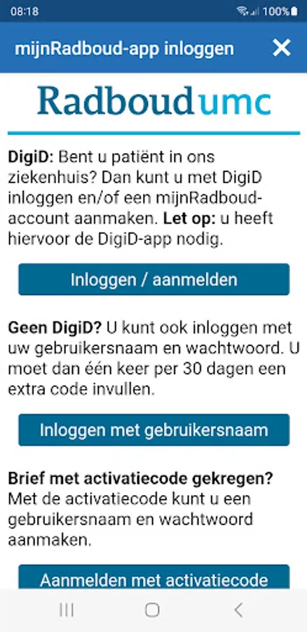 MyRadboud allows you to consult your personal medical file in a secure digital environment. The mijnRadboud app gives access to the most important functions of mijnRadboud: consult research results, overview of medicines, overview of allergies, questionnaires, view and send messages to and from the treatment team, manage and prepare appointments.
