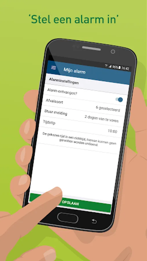 - Set alarm - In the "My alarm" function you indicate if and when you want to receive a notification of the next collection day. The alarm can be set per waste type.