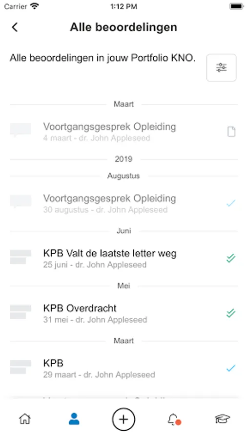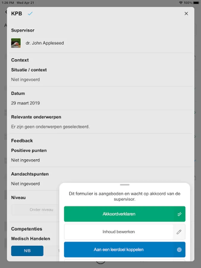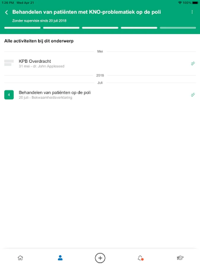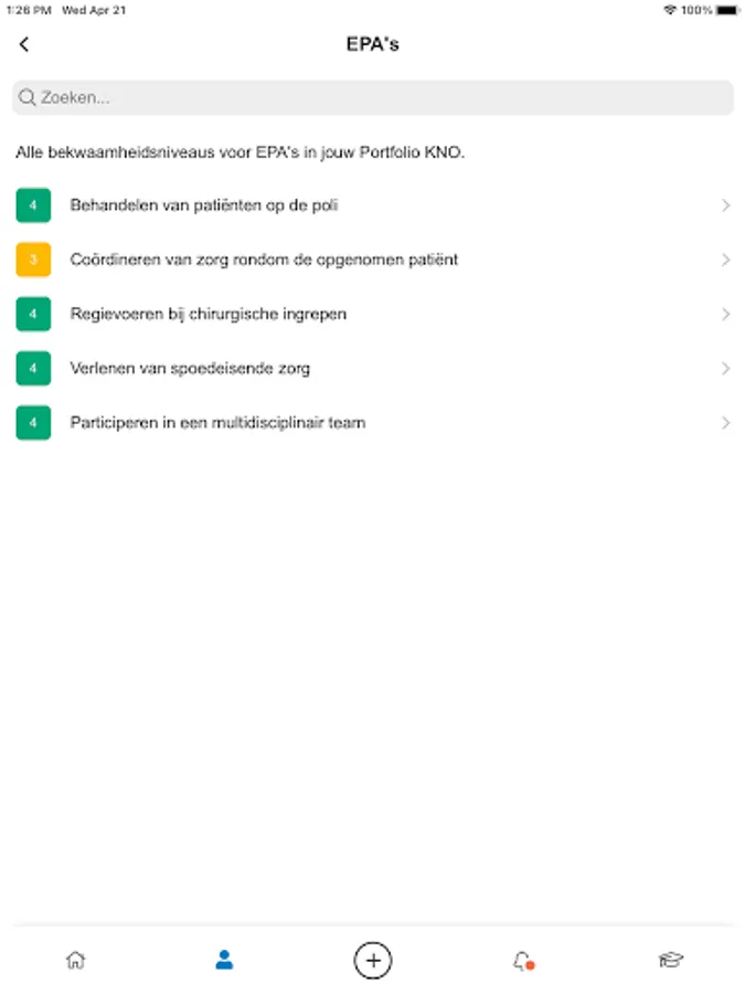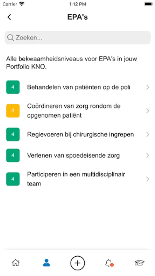 In the app you can easily enter assessments, record executed transactions and find an overview of your competence levels for EPAs and Transactions.