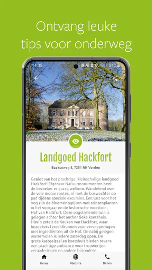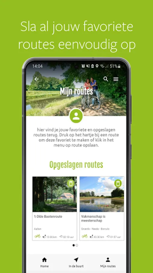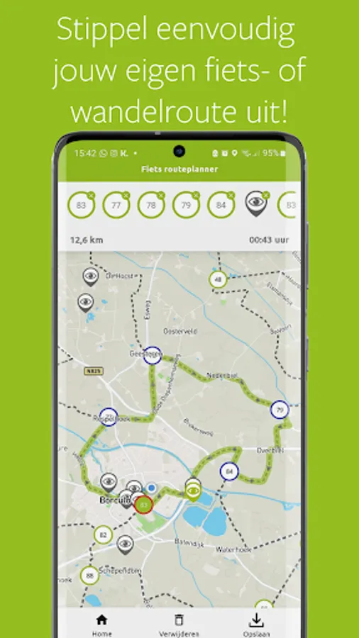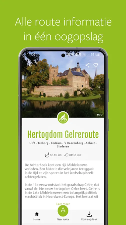 You can search in the app for routes that meet all your needs using filters and a search function. You can also easily see which routes are near you so that you can immediately set off. By clicking on a route you immediately see all information about the route such as distance, duration, places the route passes through and nice tips for the road. You can also save the route as a favorite and download it for offline use if you want to follow the route again at a later time. Prefer to map out your own cycling or walking route? This can be done with the route planner.