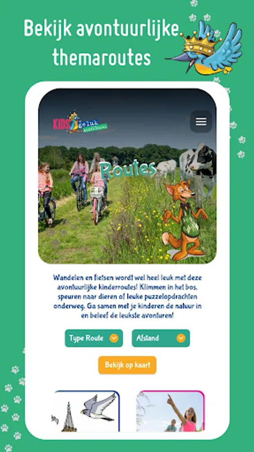 With this app your adventurous tour through the Achterhoek starts! The Kidsgeluk animal friends Aaltje, IJsbrand, Constantia, Oehoe and Lodewijk know exactly which places in our region are the best for children. In this app they share their best tips, from cool attractions for the whole family to kid-friendly places to sleep and adventurous themed routes.