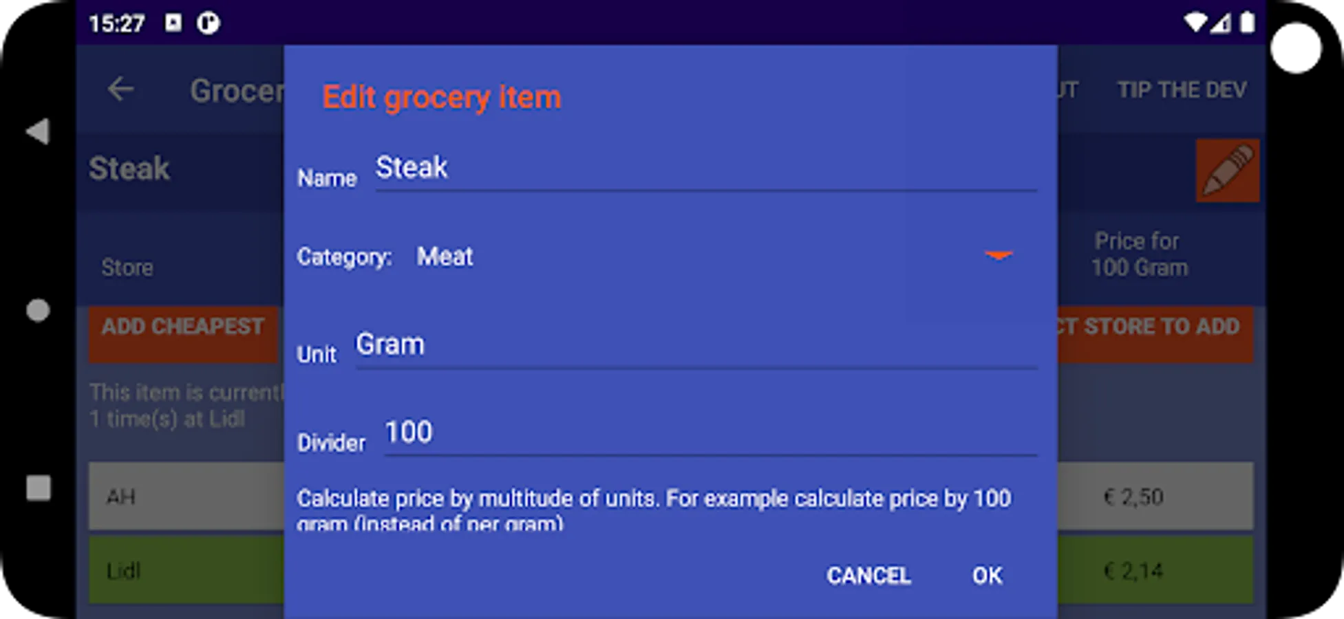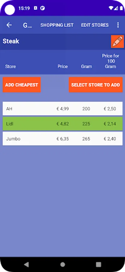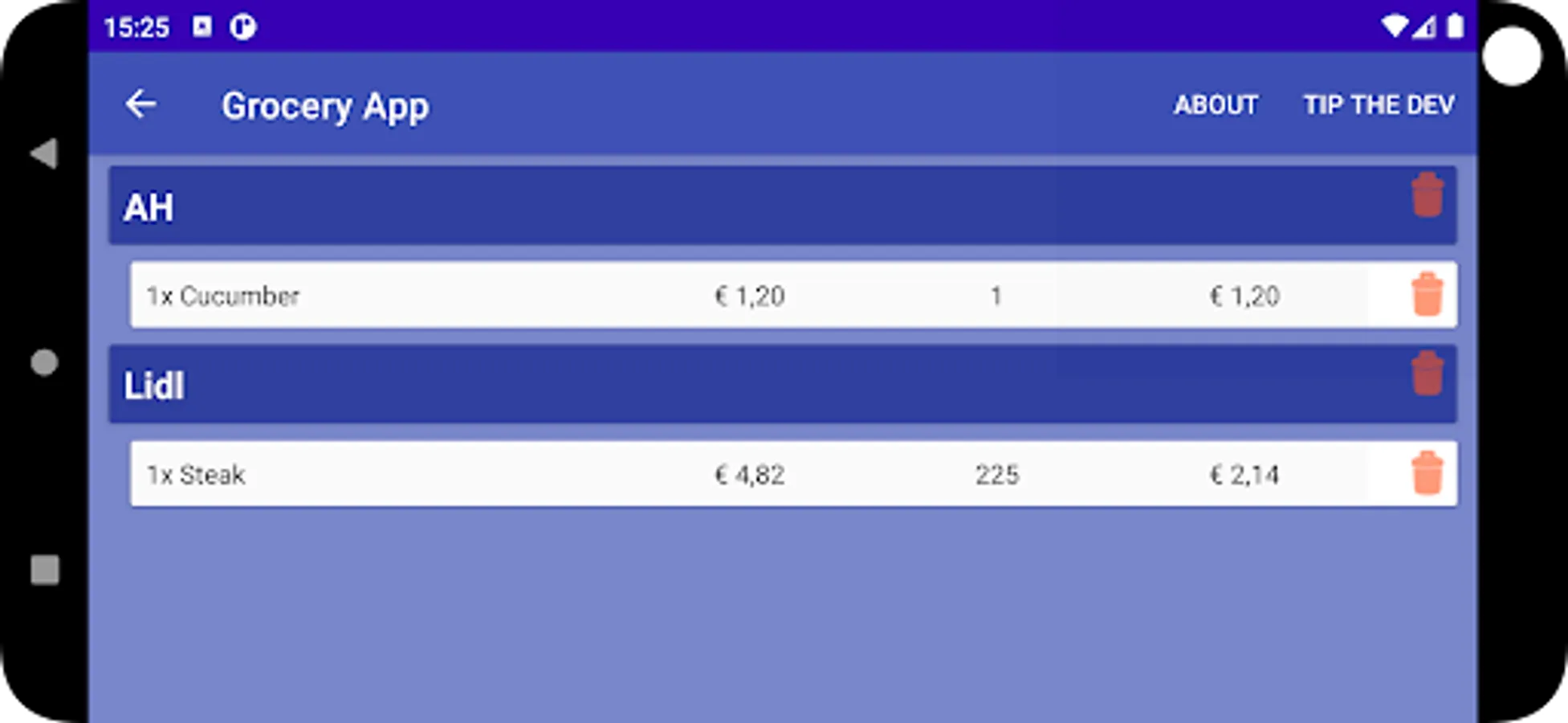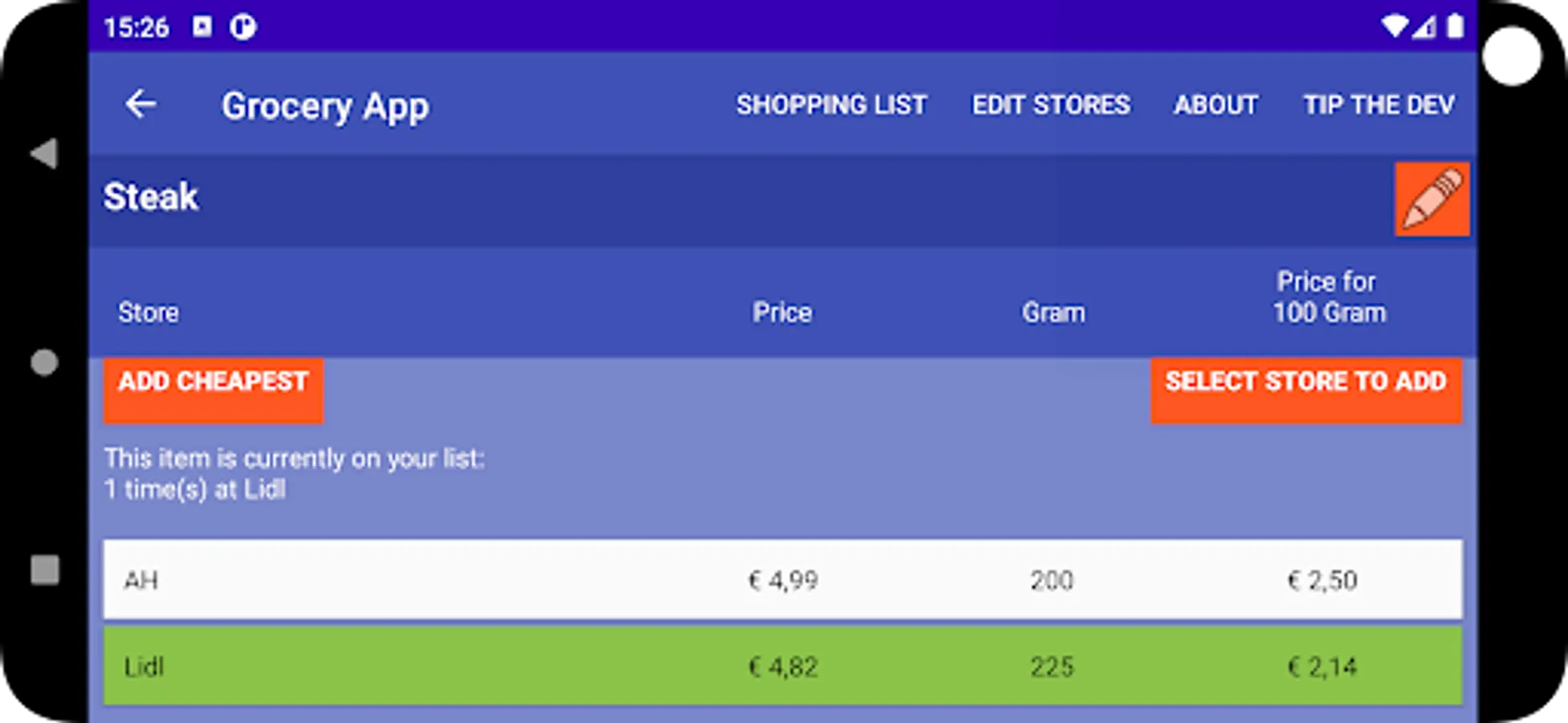 Keep track of prices of your local grocery shops so you can easily figure out which product is cheapest where.