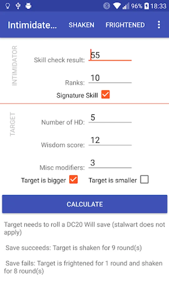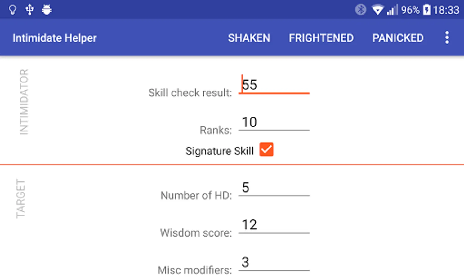 Saves you some time and math on the fly for when you have a PC in a Pathfinder game who wants to use intimidate to demoralize opponents. Includes the signature skill - intimidate unlocks. Simply input the data and let the app calculate for you.