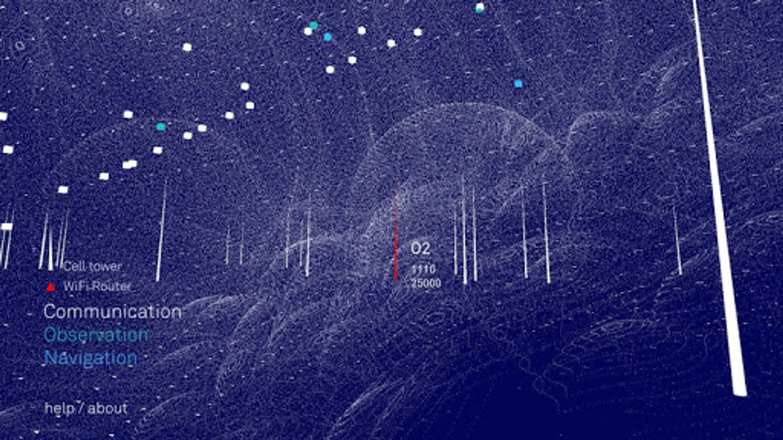 The Architecture of Radio is a 360 degree data visualization of what this world might look like. It shows the cell towers, GPS satellites and Wi-Fi routers around you that allow us to live our digital lives.