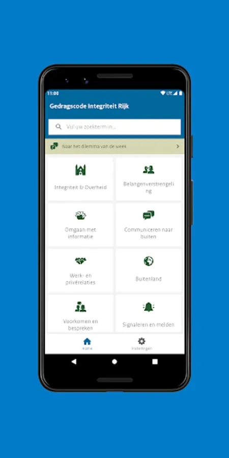 You can find the text of the full code of conduct in the app. You can find what you are looking for by choosing a category that fits your question. You can also easily search by keyword. For example, what should you do with gifts? What questions can you ask yourself about ancillary activities? Who can you contact if you notice undesirable behaviour? What about secrecy? And how do you start a good conversation about integrity?