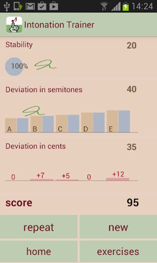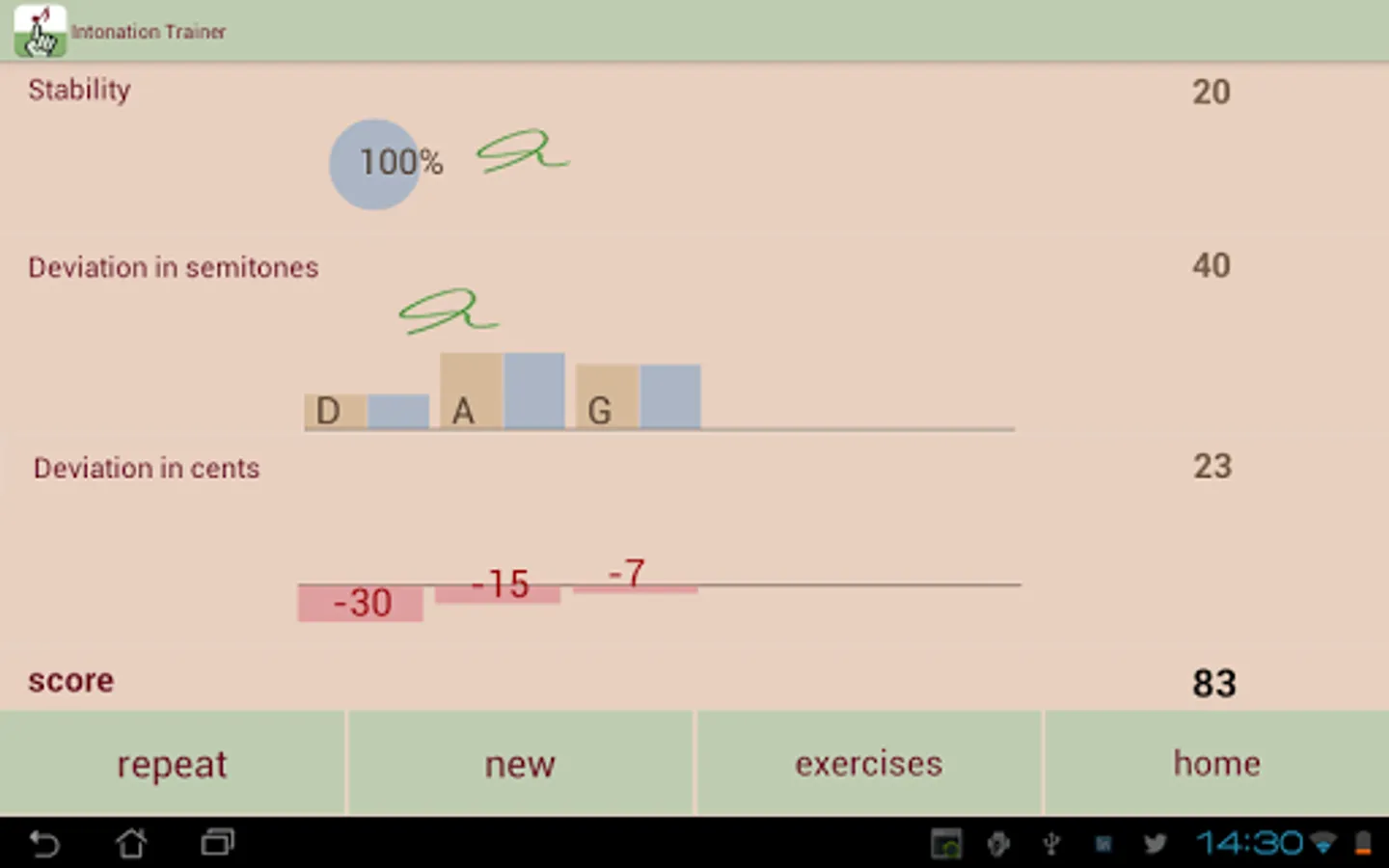 The app plays vocal exercises of one to five notes, listens to you when you repeat the given notes, and displays your score in a graphic. With this immediate feedback your performance level will improve quickly, and your singing confidence will increase dramatically. You practice every register of your voice, also the regions that you normally only use incidentally.
