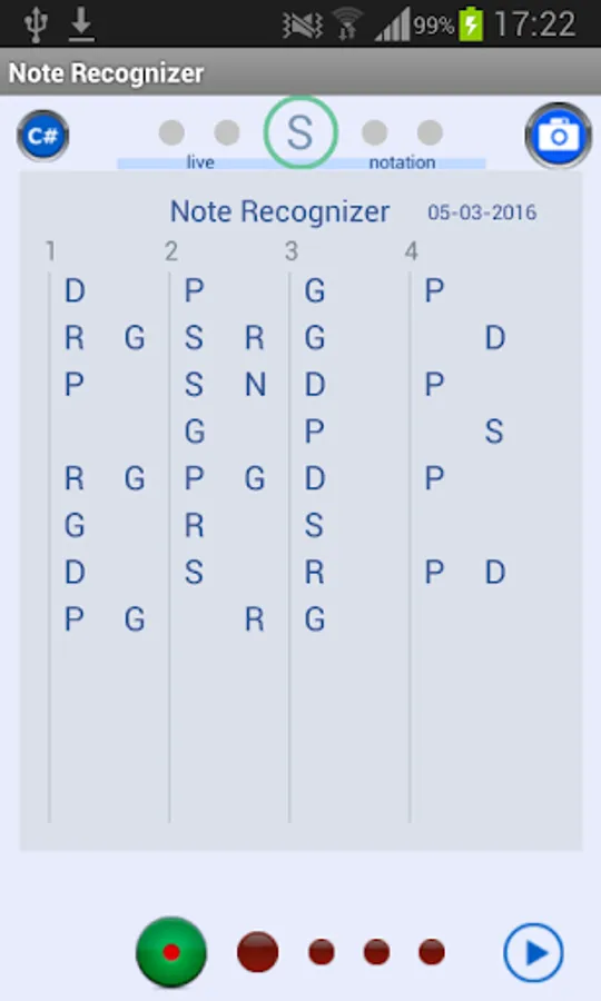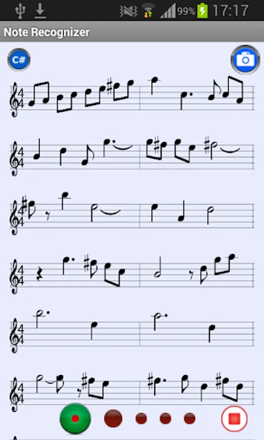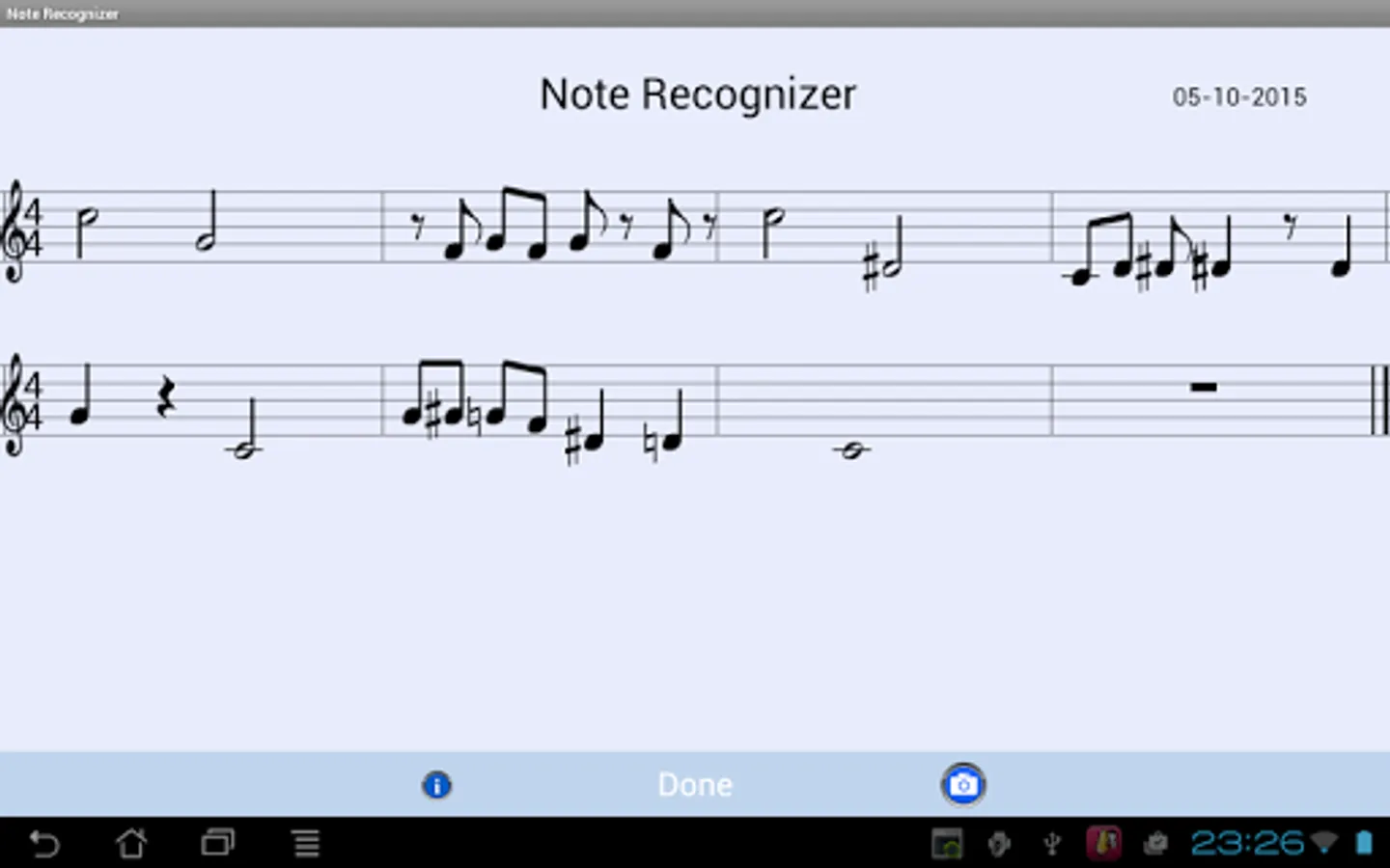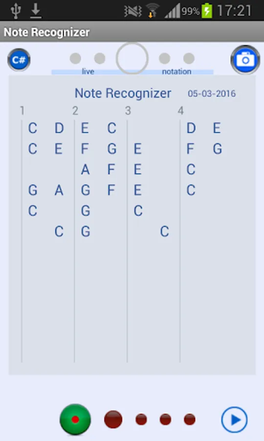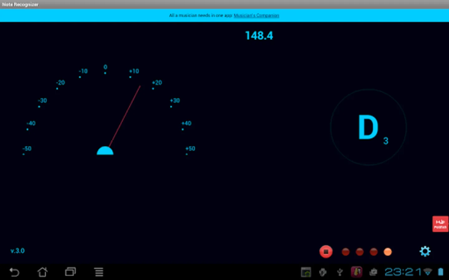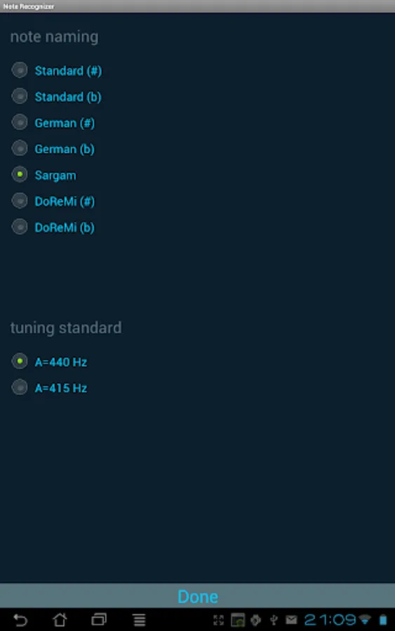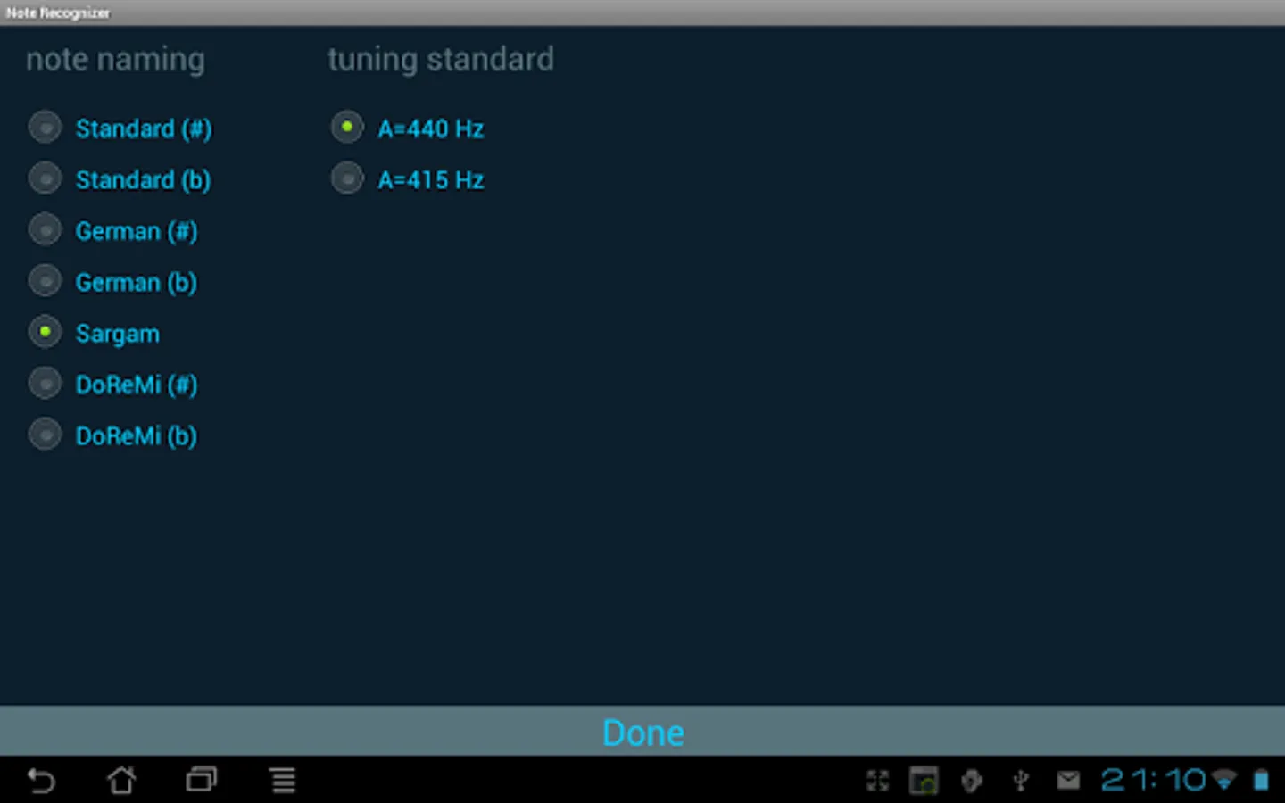 The Note Recognizer is meant for people who are seriously involved in active music making. This app is not a game. The Note Recognizer analyses the pitch frequency that you sing or play, and gives the corresponding note name. Very useful for singers who need to find the right starting note of a song. Or if you want to know the key of a song; sing the tonic, and you get the note name of the key. Also great as a tuner for guitar, or checking your intonation on flute, violin or any instrument. No fancy graphics, but perfectly visible layout for dark venues and gloomy practice environments. Choose from different note naming systems such as Indian Sargam or Do Re Mi.