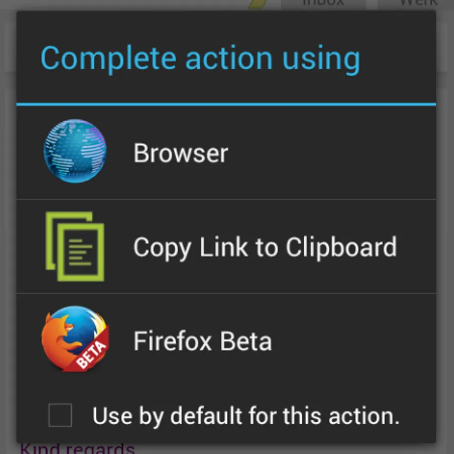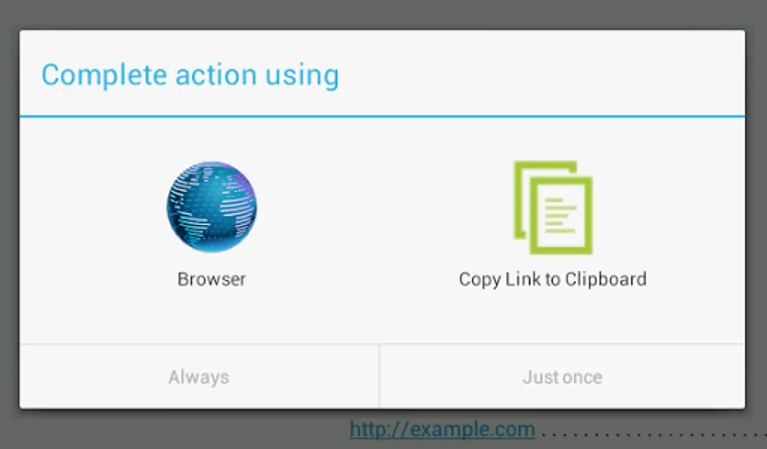 Adds a "Copy Link to Clipboard" option to the browser selection menu and the share menu. After choosing "Copy Link to Clipboard", the URL will be copied to the clipboard and briefly displayed without leaving your previous app.