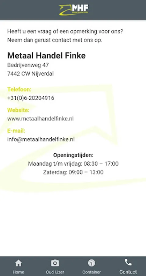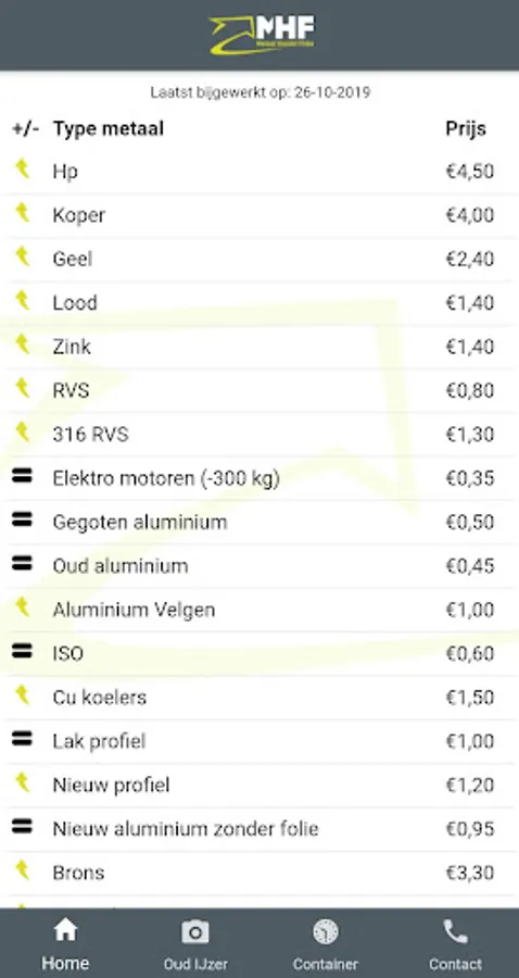 Do you want to know the current price of the Oud IJzer? With the mobile app from Metaal Handel Finke you are always aware of the current daily prices in Ferro and Non-Ferro metals.