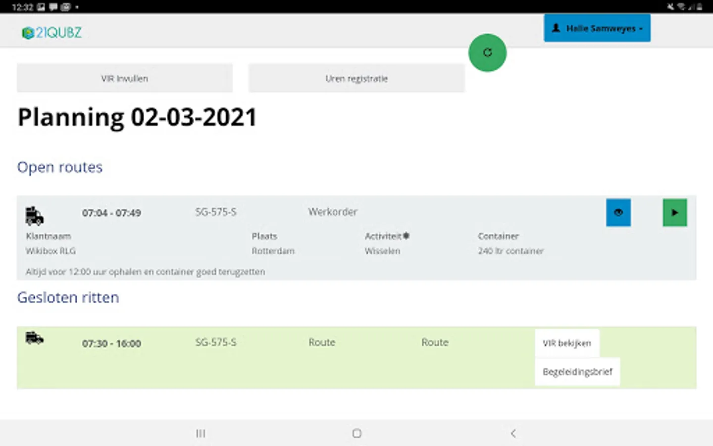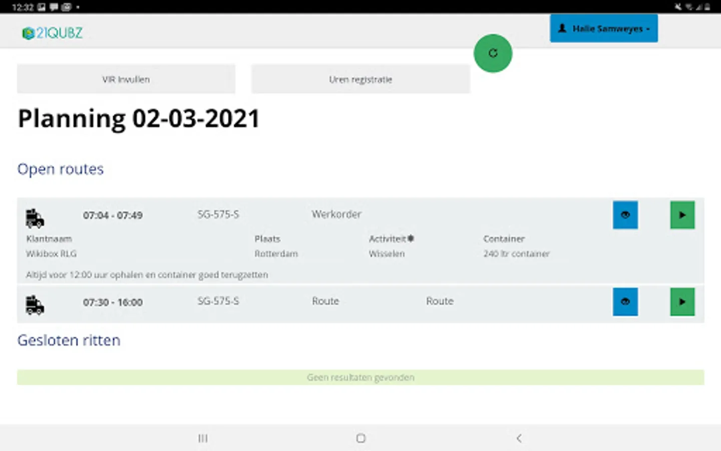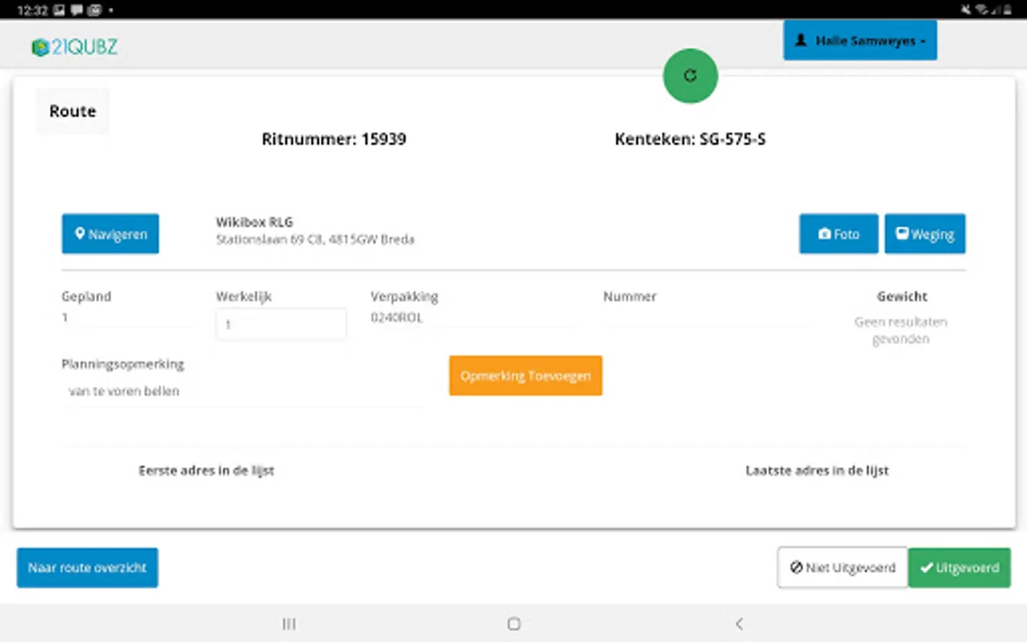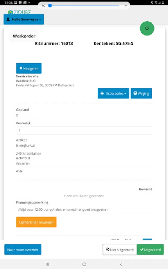 The application communicates with the 21Qubz platform. The information of work orders and route is supplied from 21Qubz. These work orders and routes that the driver must complete per day are visible and can be navigated to. These can then be set to executed or not executed, depending on whether the waste has been handled. Comments, photos and any weightings can be added to this.