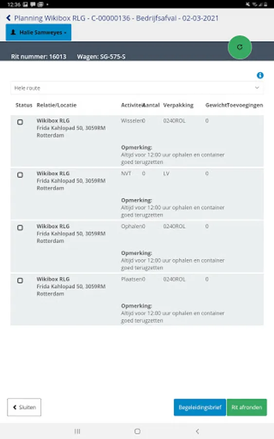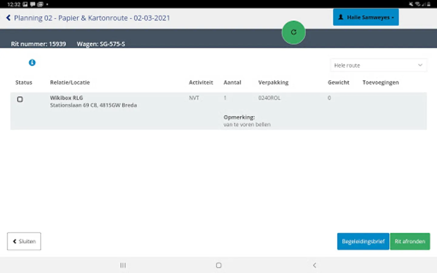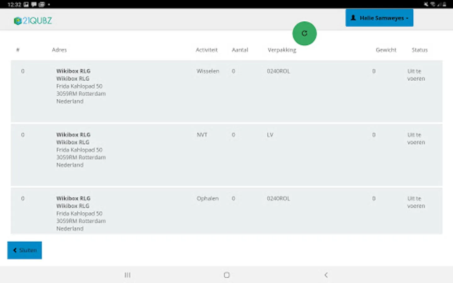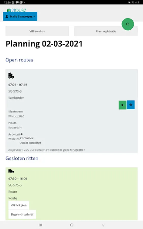 The application communicates with the 21Qubz platform. The information of work orders and route is supplied from 21Qubz. These work orders and routes that the driver must complete per day are visible and can be navigated to. These can then be set to executed or not executed, depending on whether the waste has been handled. Comments, photos and any weightings can be added to this.