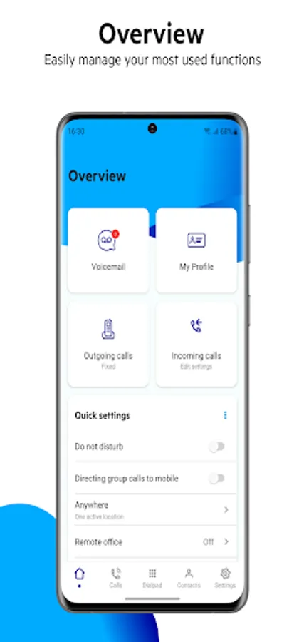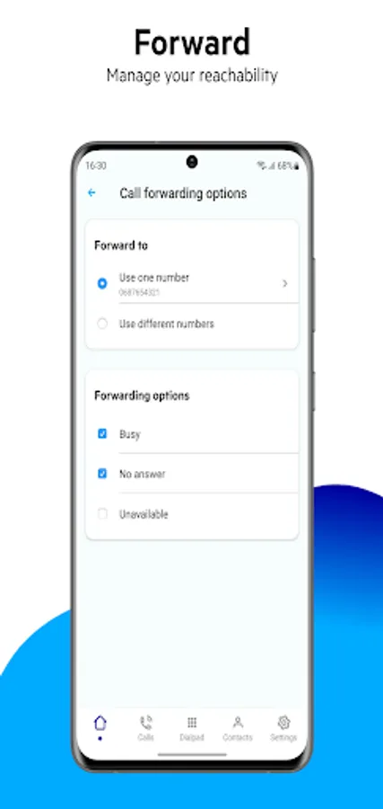 You can quickly forward all calls to voicemail, a colleague or other number or you can choose to present a recorded message stating that you are not available. If you have Fixed Mobile integration activated, you can set the way you want to be reachable and with whitch number/identity you want to call.