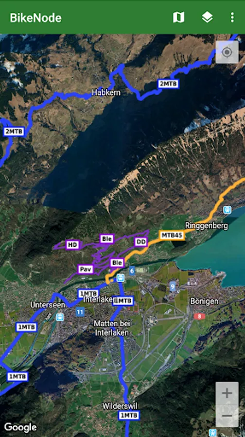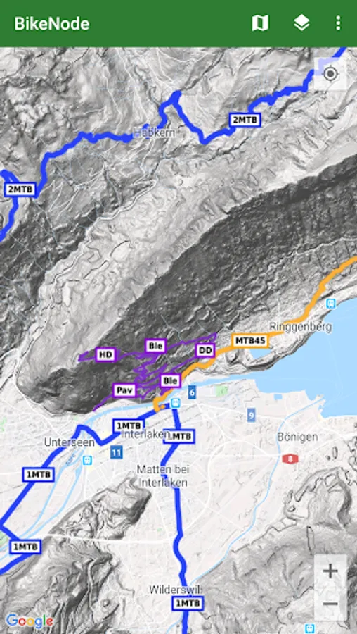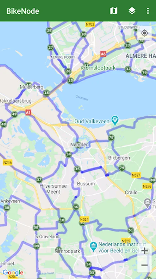 BikeNode is not a navigation app; it just shows an overview of all routes in different colors on the map.