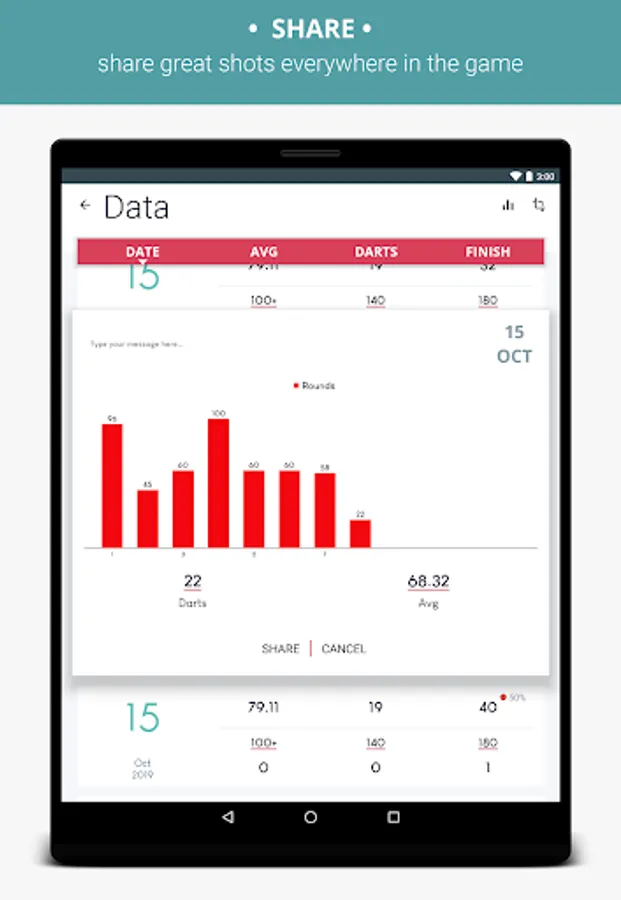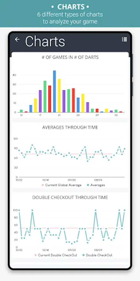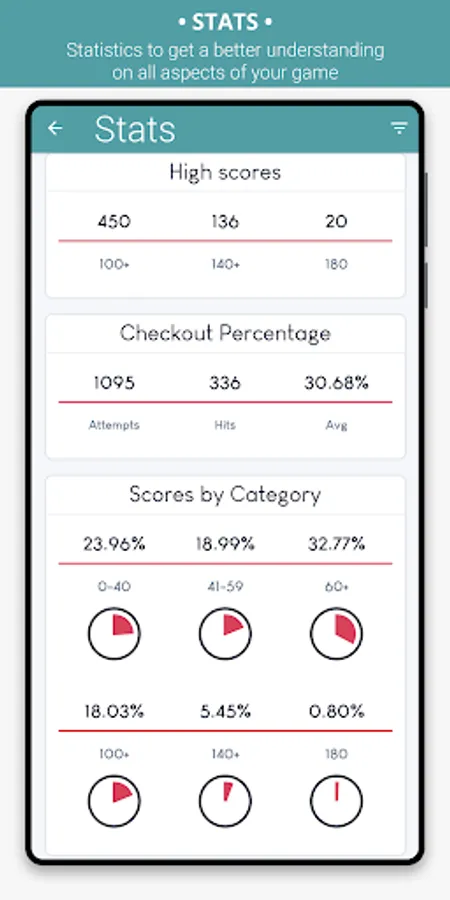 Legs and averages per month, Double checkout percentage, first 9 darts average: every aspect of your game will be monitored so you can get a clear understanding of what it is your game is lacking.