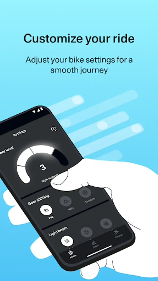 • Adjust your bike settings instantly on the home screen. You can change your motor assistance, gears, lights, bell sound, and other bike sounds.