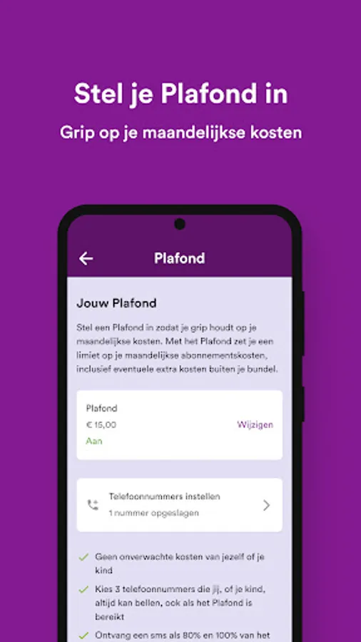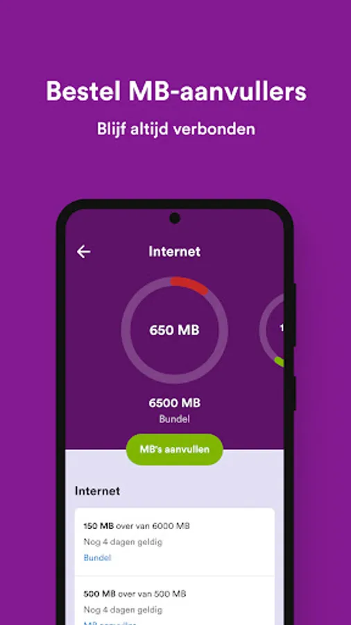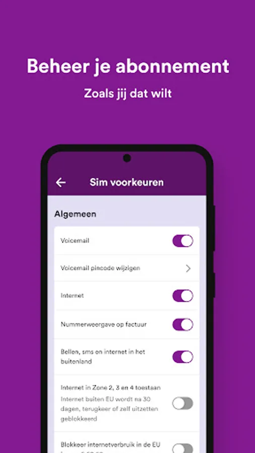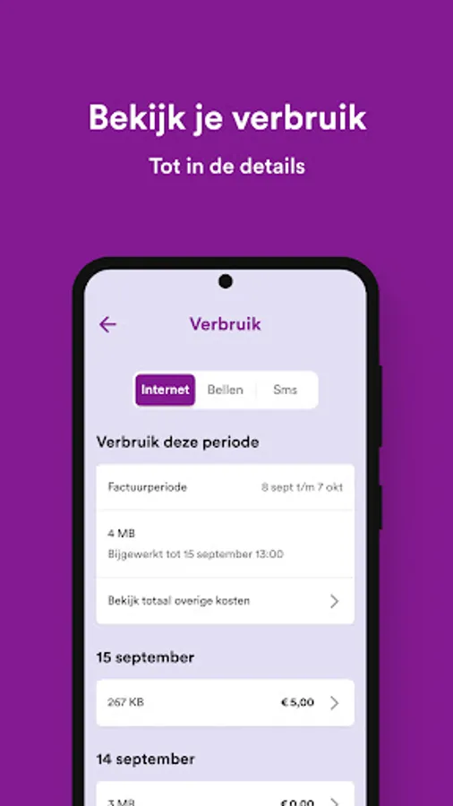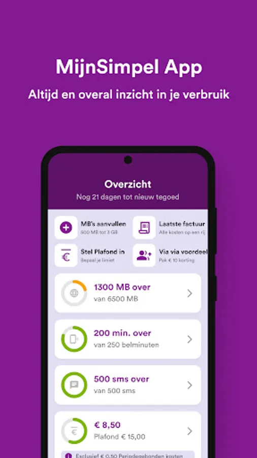 The My Simple app you have anytime, anywhere insight into your consumption. You can manually change your bundles, manage your data and settings, see invoices, set Ceiling and more. So you always have control over your costs.