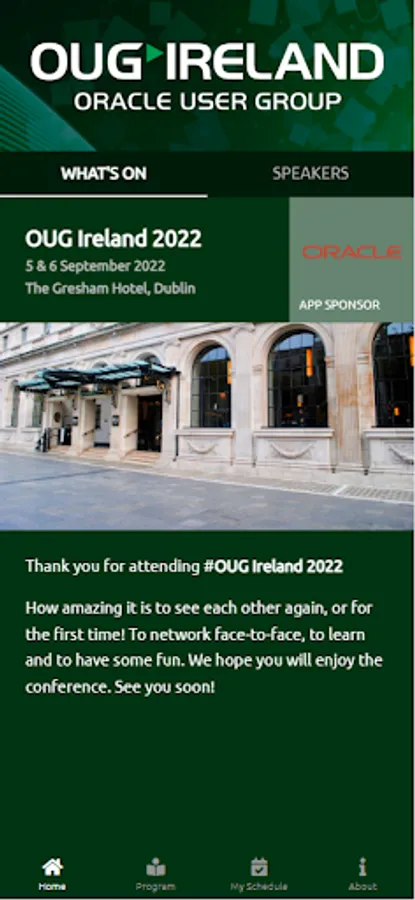 If you're attending OUG Ireland 2022, this is the official App from UKOUG & SMART4Solutions to keep you informed. The App supports attendees by providing on demand essential information about the event. Access location maps, event agenda, look up speaker bios, etc. as you move through the conference. You will receive messages if event meetings change.
