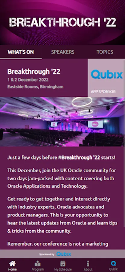 If you're attending UKOUG Breakthrough 2022, this is the official App from UKOUG & SMART4Solutions to keep you informed. The App supports attendees by providing on demand essential information about the event. Access location maps, event agenda, look up speaker bios, etc. as you move through the conference. You will receive messages if event meetings change.