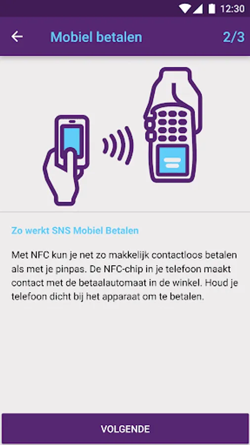 You can make mobile payments if you: have a current account with SNS + a device with the newer versions of the Android operating system with NFC chip + the SNS Mobile Banking app.