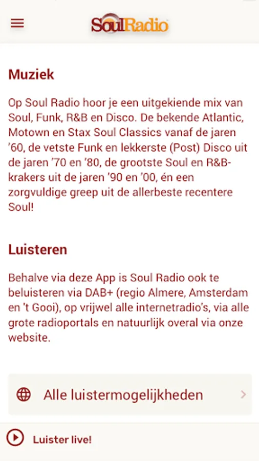 The coolest classics and the best new Soul! Op Soul Radio hoor je een uitgekiende mix van Soul, Funk, R&B en Disco. De bekende Atlantic, Motown en Stax Soul Classics vanaf de jaren ’60, de vetste Funk en lekkerste (Post) Disco uit de jaren ’70 en ’80, de grootste Soul en R&B-krakers uit de jaren ’90 en ’00, én een zorgvuldige greep uit de allerbeste recentere Soul!